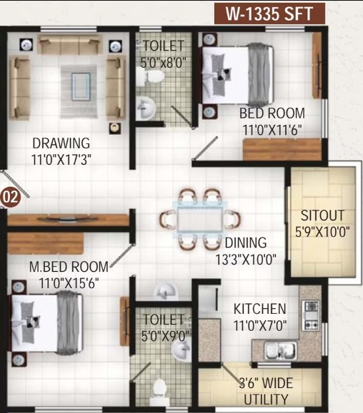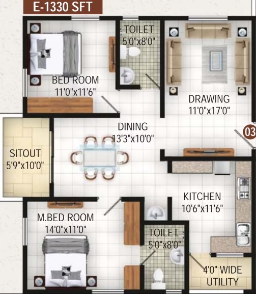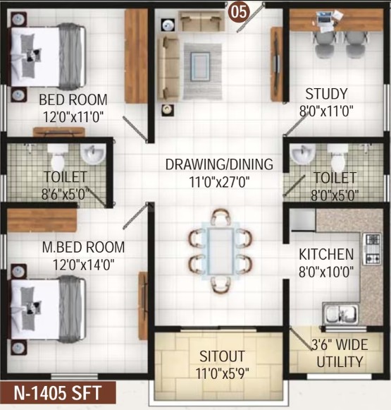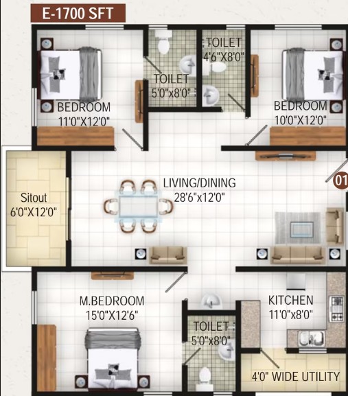 Good quality anti-skid tiles for flooring and skirting. Provision for washing machine and dish washer.