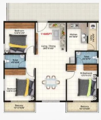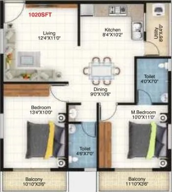 Vitrified tiles for the living area, kitchen and bedrooms and Anti-skid ceramics tiles for balconies.