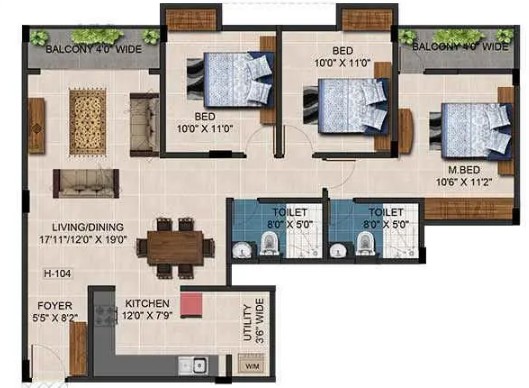 Living, dining, bedroom and kitchen: Vitrified tiles / equivalent.