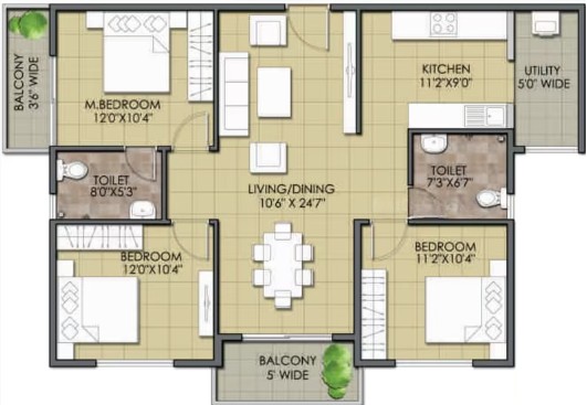 Hall, dining and bedrooms with vitrified tiles (24" x 24").