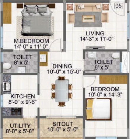 Vitrified tiles in living, dining, bedrooms, kitchen and non-skid tiles for the utility and Balcony.