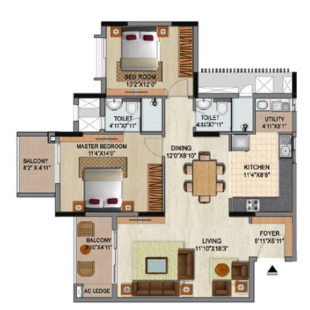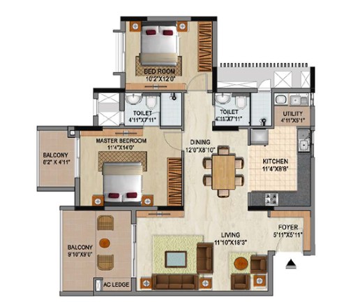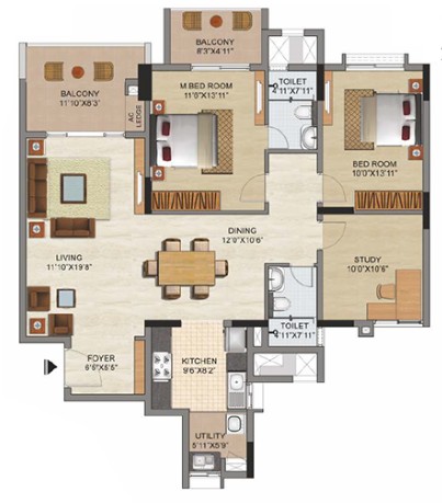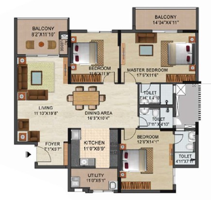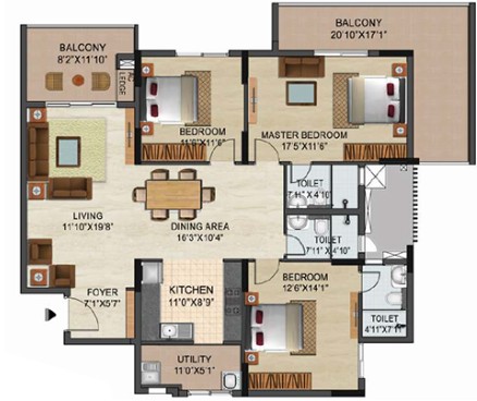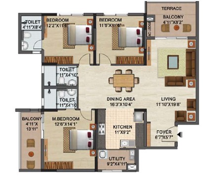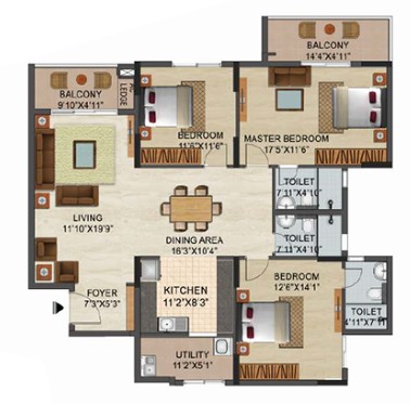 Good quality 2’x2’ vitrified tiles for living, dining, bedrooms and kitchen. Ceramic tiles for balcony and utility.