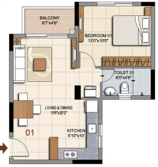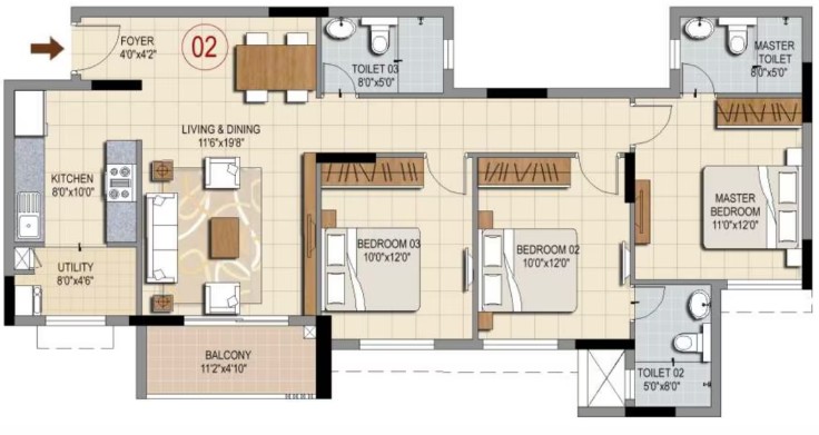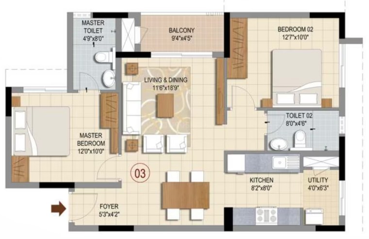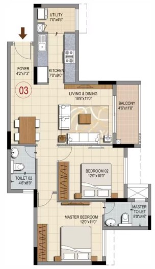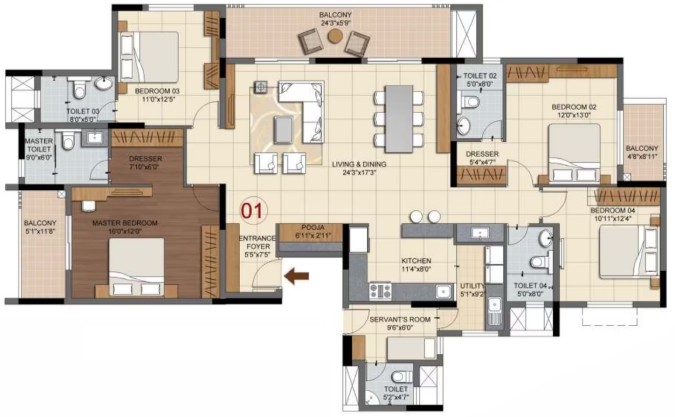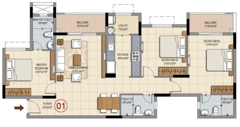 Balconies / Utility / Toilets: Anti-skid ceramic tiles.