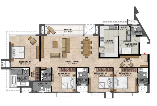 Master toilets will have quartz/engineered stone on the floor and walls up to the false ceiling. Other toilets will be done with high quality ceramic tiles