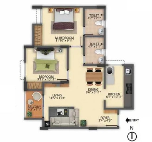• Premium Quality Vitrified Tiles flooring in Foyer, Living, Dining, Kitchen and Bedrooms