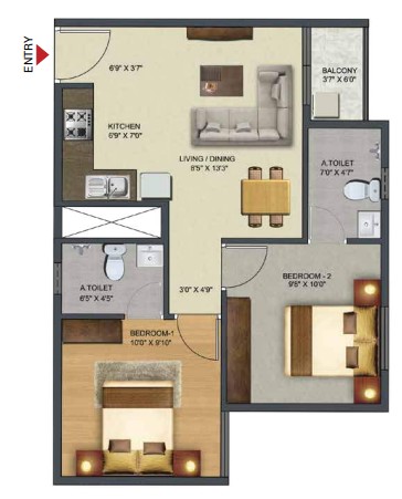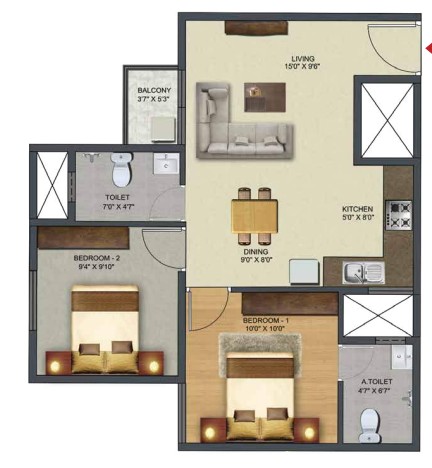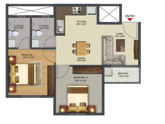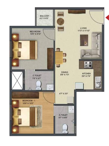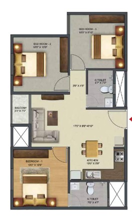 SOMANY/RAK or Equivalent make Vitrified tiles for living, dining, kitchen & all bedrooms.