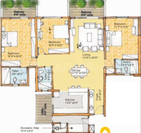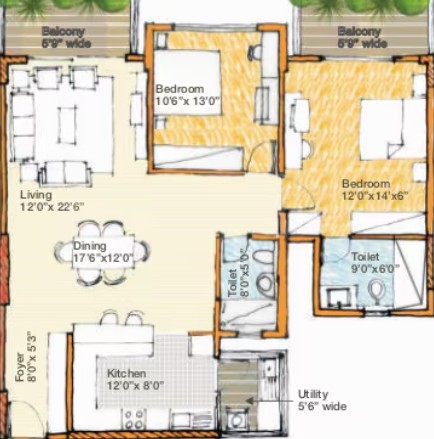 Vitrified Tiles for Foyer, Living, Dining, Passage leading to Bedrooms, and Ceramic Tiles for Bedrooms, Kitchen, Utility and Balconies. Combination of marble, Granite, Vitrified/Ceramic or other materials as per design for common areas.