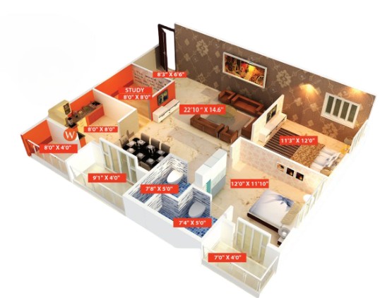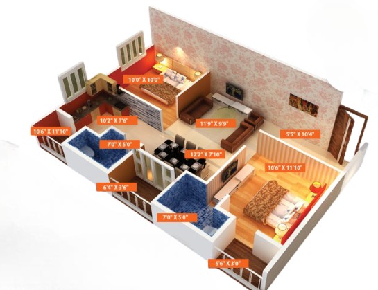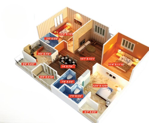 Hall , dining and bedrooms: Flooring shall be of vitrified tiles for Hall & dining area (2’.0’’ x 2’.0’’ size). And for all other rooms Ceramic tiles to be used for flooring.