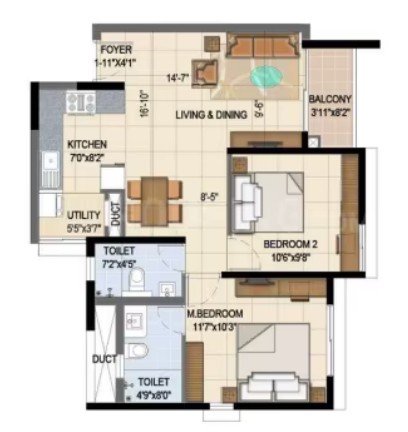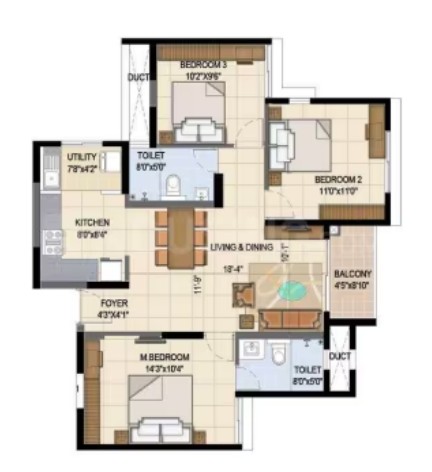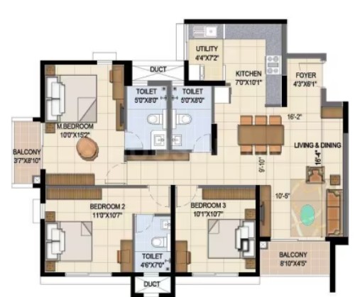 Living areas: Vitrified tiles in foyer, living, dining, all bedrooms, passage, and kitchen.