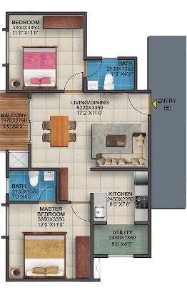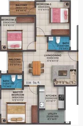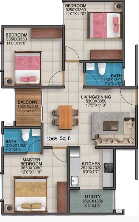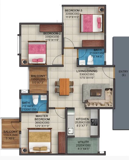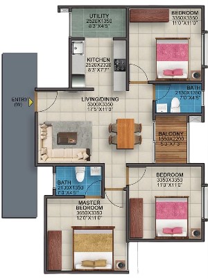 Vitrified tile flooring in living, dining, all bedrooms, kitchen and passages leading to bedrooms