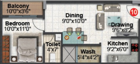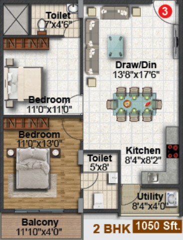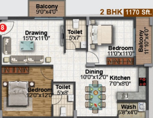 Vitrified tiles Flooring. For living, dining, kitchen and all bedrooms. Ceramic tiles for balconies, Anti-skid tiles in toilets of a minimum size.