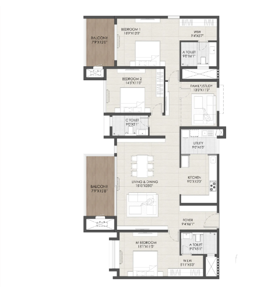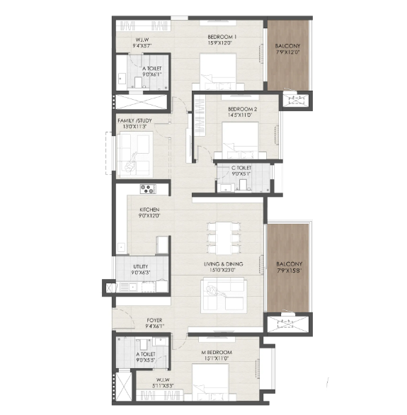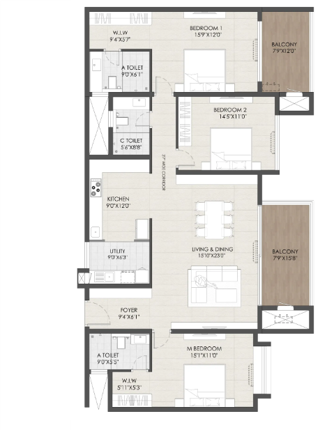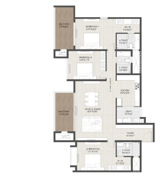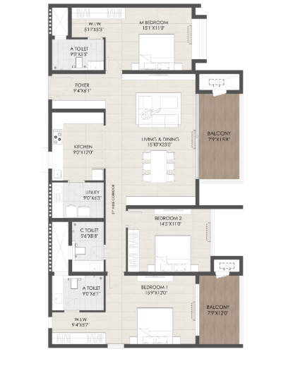 Unit sizes of the Vajram Chrysanthemum ranges from 2237 - 2630 Sq.Ft .