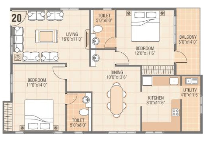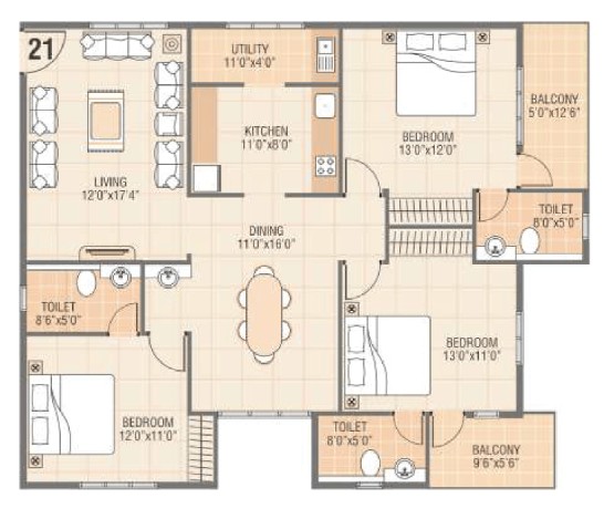 Superior quality vitrified tile flooring in all rooms.