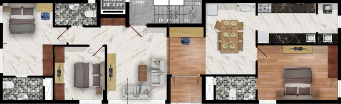 • Balconies – Matte finish tiles 600*600mmwith Polished Granite top