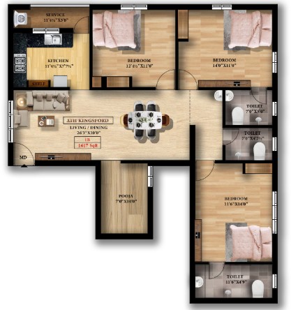 Living, dining and utility area – 2’0” x 2’0” vitrified tiles with spacers.