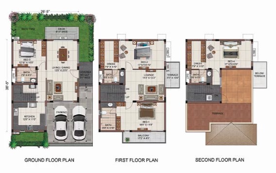 Terrace : Anti-skid vitrified tiles of size 600x600mm in combination with pressed tiles