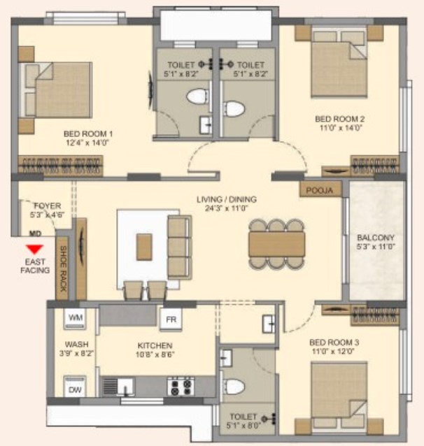 15A plug points will be provided for Refrigerator, Washing machine, Micro-oven, Hob and Dishwasher.