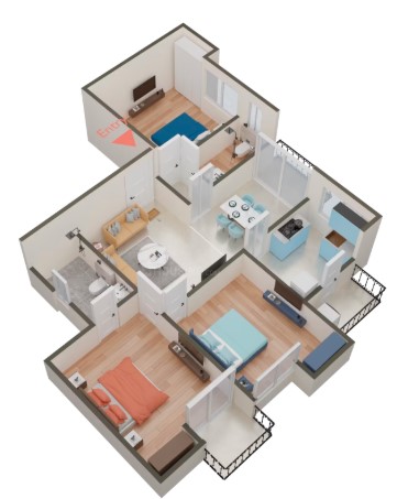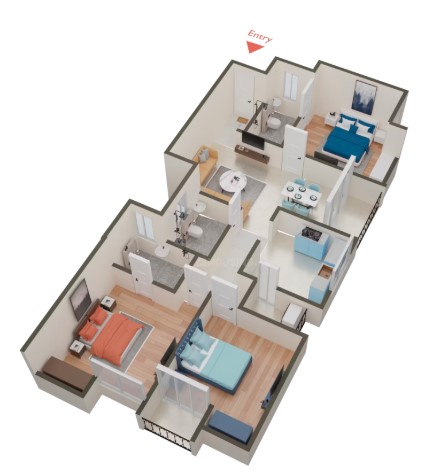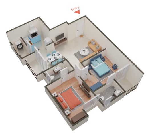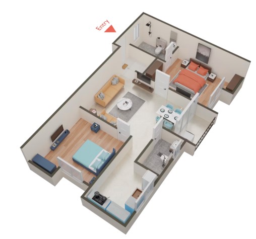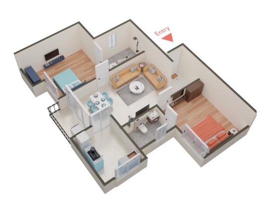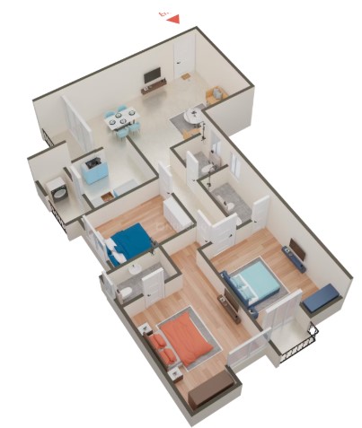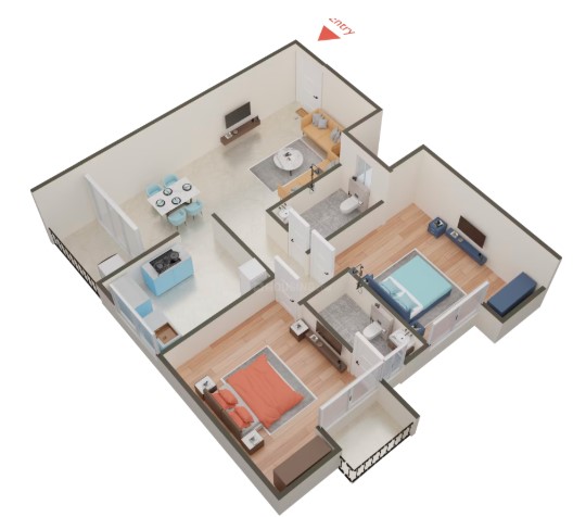 Living/dining/bed/kitchen with 24" x 48" (2 x 4) vitrified tiles of Johnson/AGL/Varmora or equivalent brand.