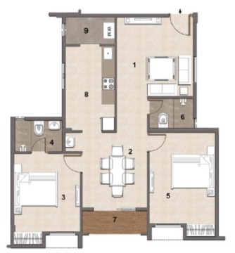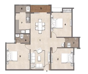 The flooring in living, dining, bedrooms, and kitchen will be of 600 x 600mm Vitrified tiles of Asian/RAK/Euro/Spaniso/Ceracon/ Kajaria or equivalent.
