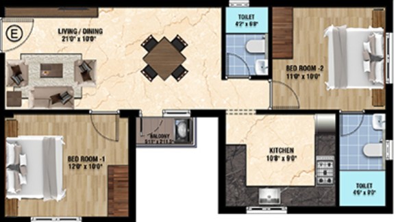 Entire flat except Bathroom, Kitchen Service & Balcony with 2X2 VITRIFIED TILES (Orient/Equivalent).