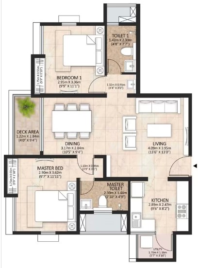 Kitchen (2’ above platform) and toilets (up to false ceiling level) 300 x 600 Ceramic glossy finish