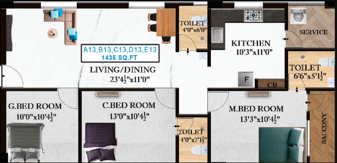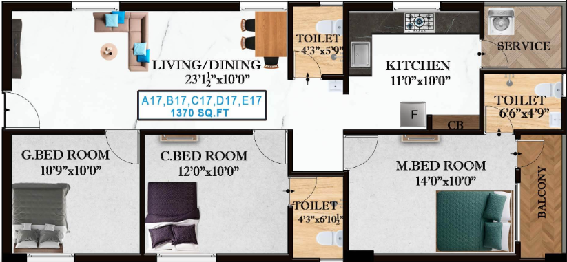 Vitrified Tiles for Living,Dining, Bed rooms & kitchen, Antiskid tiles for bath rooms , Granite flooring for staircase & corridor . Brand-Kajaria/Johnson/Somany.