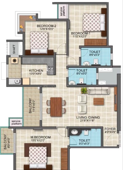 Living, Dining, Kitchen, Foyer, Passage, Bedrooms: Vitrified tile with skirting of 4"