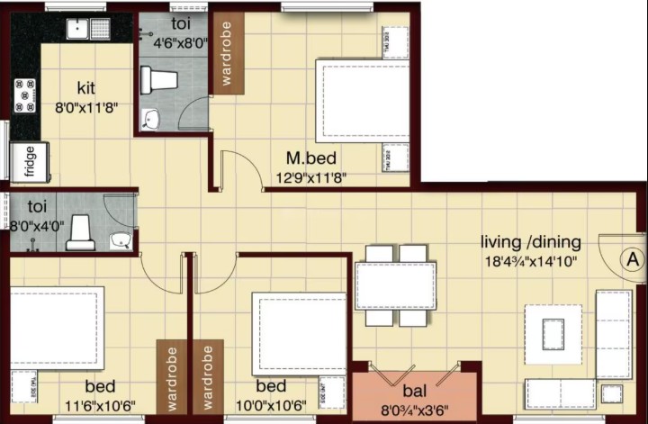 Entire flat will have 2’ x 2’ Vitrified tiles flooring of basic colors will be laid. Balcony and passage flooring anti skid tile