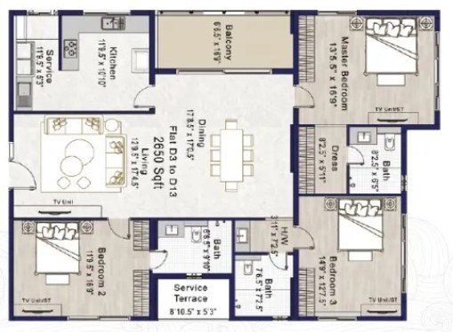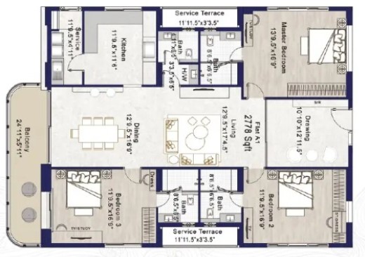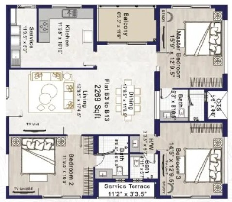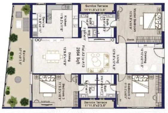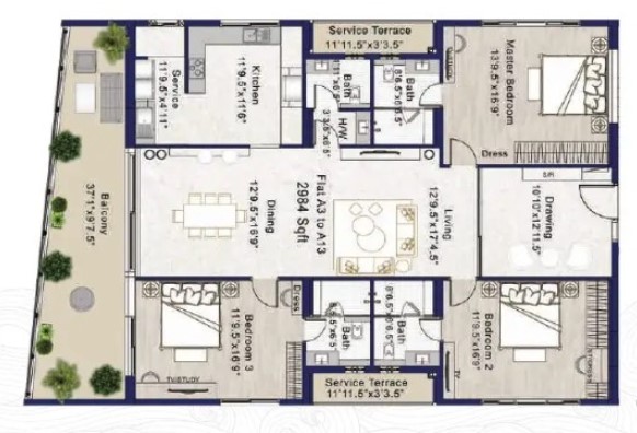 Unit sizes of the Rajparis Blue Jewel ranges from 2221 - 2984 Sq.Ft .