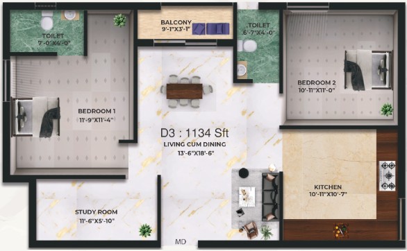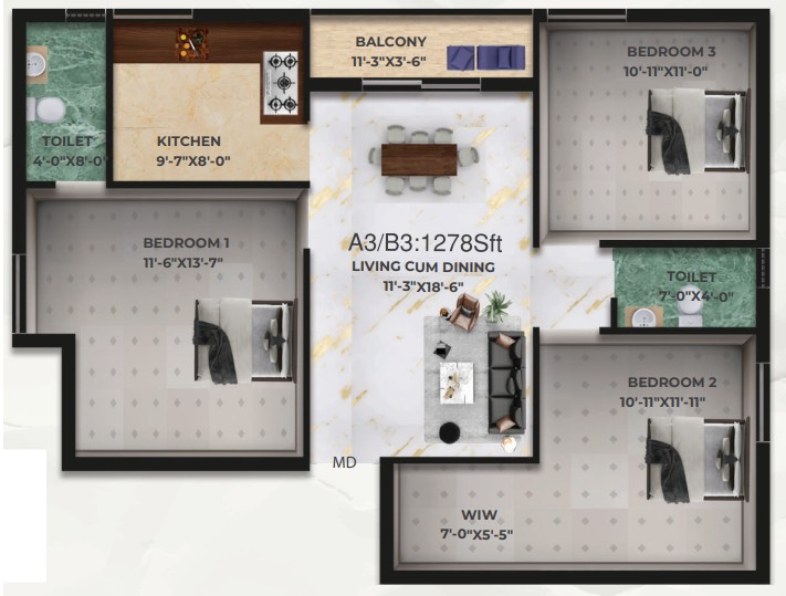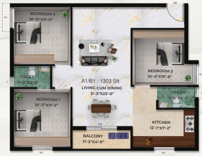 Living, dining & bedrooms – will be finished with 4’ x 2’ vitrified tiles with matching Skirting.