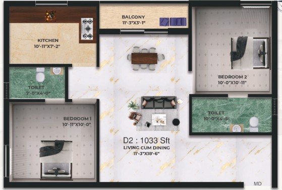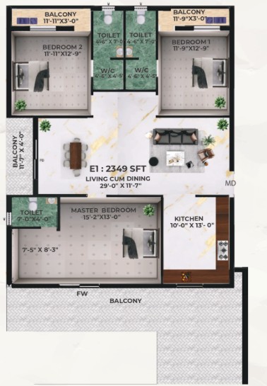 • Toilets, kitchen , balconies and other areas will be finished with cement plaster and Emulsion paint.