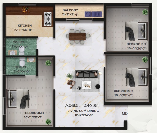 Kitchen, balconies, toilets & wash / service area – will be finished with non Slippery vitrified tiles.