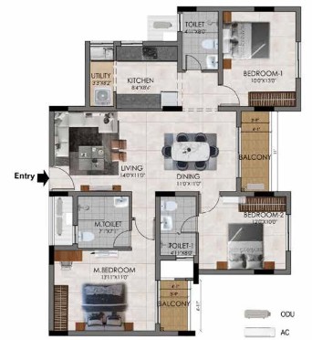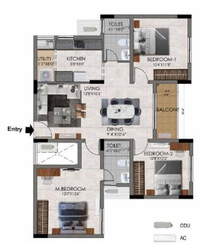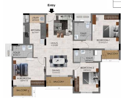 With a total of 220 3 BHK units spread across 15.6 acres’ landscape area, covers a unit size range of 1148 – 1491 sq.ft. Designed across 4 blocks with 5 floors (Stilt + 4 floors), the residential layout ensures privacy and ample open breathing space. Every apartment here is made to provide seamless flow of air & light, natural ventilation, ample space, balanced layout, that supports both utility and comfort.