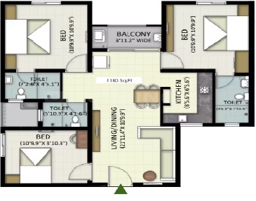 • Living/Dining area 60cm X 60cm Vitrified tiles