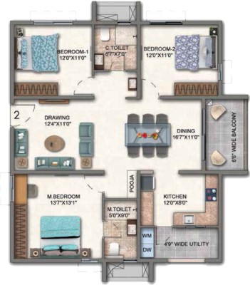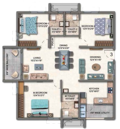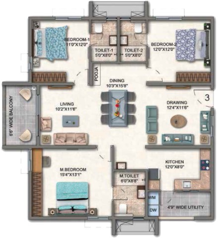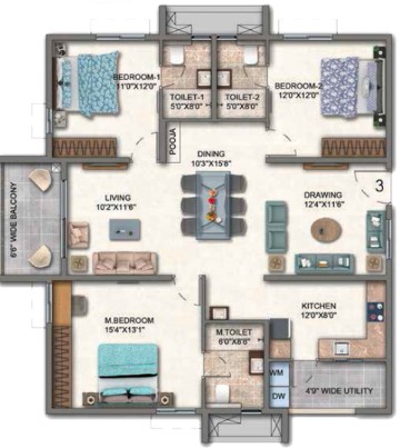 3 BHK + 2 TOILETS: 2 Car Parks for each Apartment.