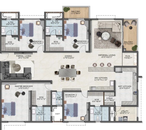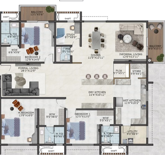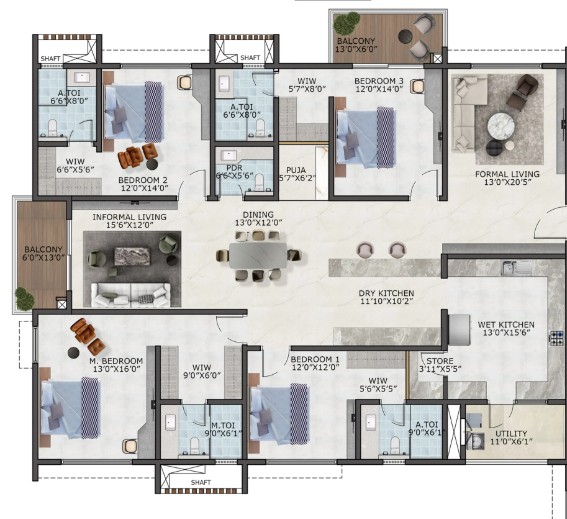 The project offers a mix of 3, 4, and 5 BHK apartments, which already tells you it’s built for those who prefer roomier homes. Sizes range from 3356 to 5100 sq.ft, so this isn’t the standard compact stuff you often see in the city. It’s more like apartment living, but with the comfort of villa-sized interiors.