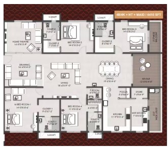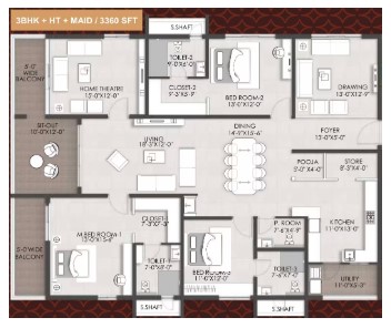 Drawing, Living, Dining, Pooja, Kitchen & Bedrooms: Large format double charged vitrified tiles of 2'x4 & 2%'x5' with PVC Spacer and Epoxy Grouting 3" skirting.