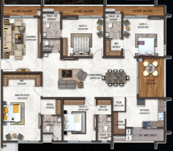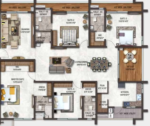 LIVING BALCONIES/SITOUT: Tiles/Granites or other material as per architect design