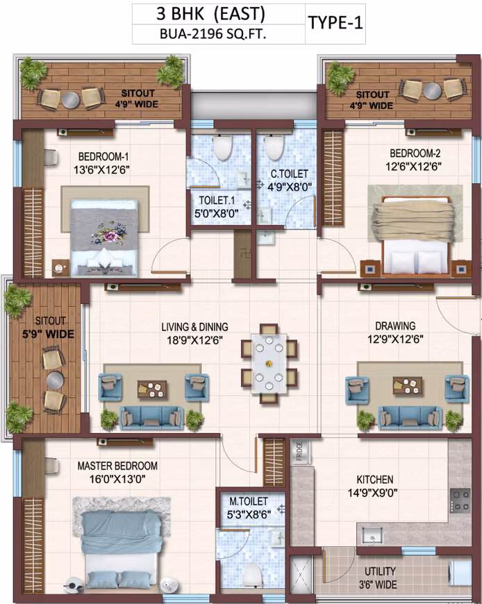 Utility Area: Anti-skid ceramic tile flooring and glazed ceramic tile dado in tap area up to 3 feet height of superior quality.