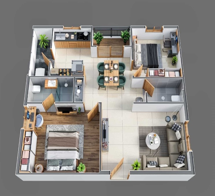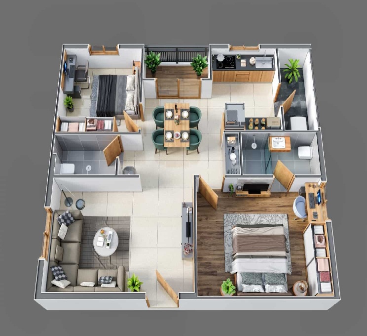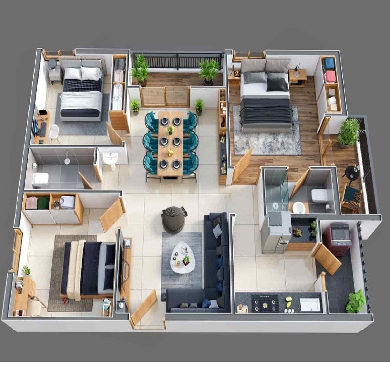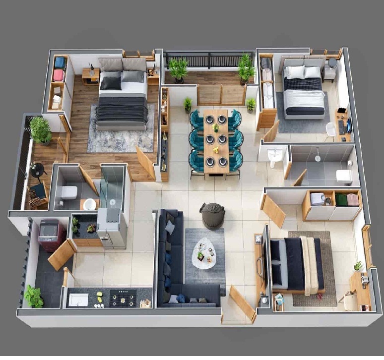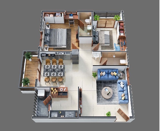 Granite kitchen platform with stainless steel sink. Ceramic tile wall cladding up to a height of 2' above kitchen platform. Electrical points to suit the electrical appliances needed in the kitchen. Provision for washing machine in the utility area.