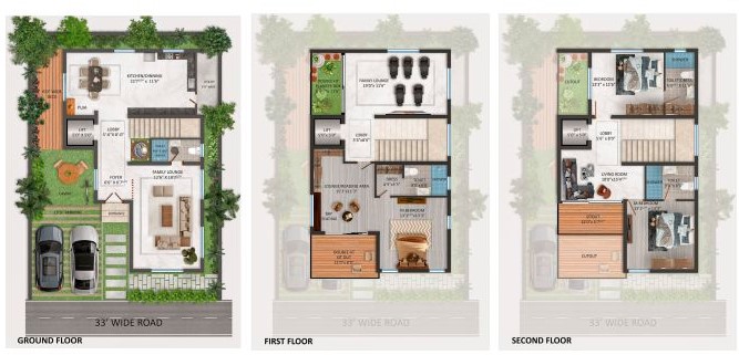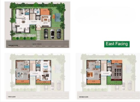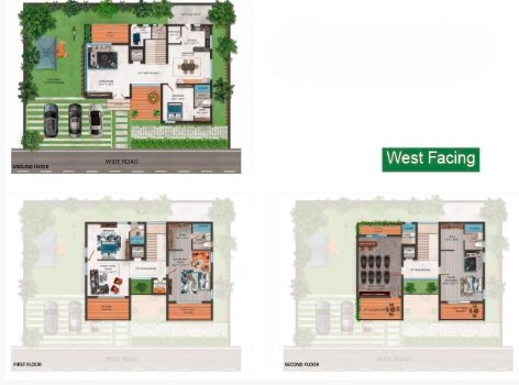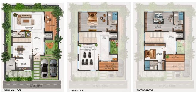 First floor master bedroom and home theatre/multipurpose hall with wooden lamination; bathrooms with premium vitrified tiles on walls and floor.