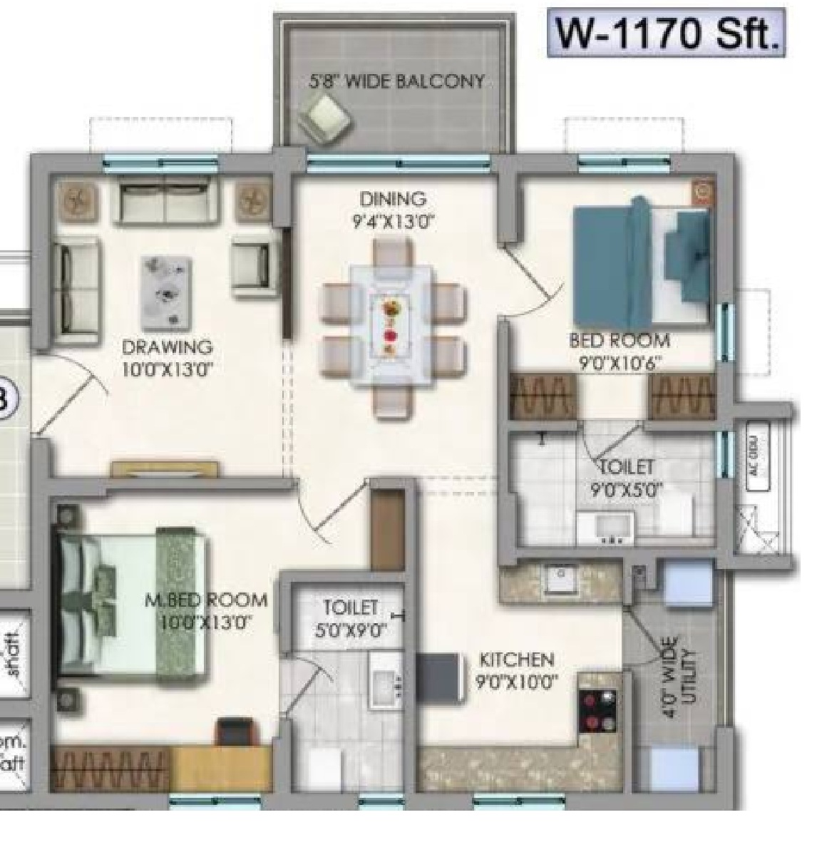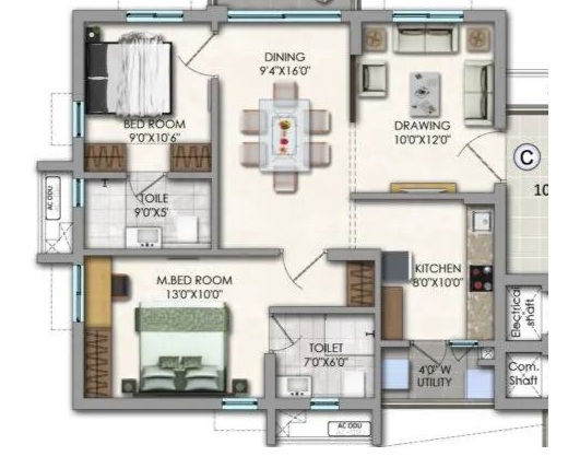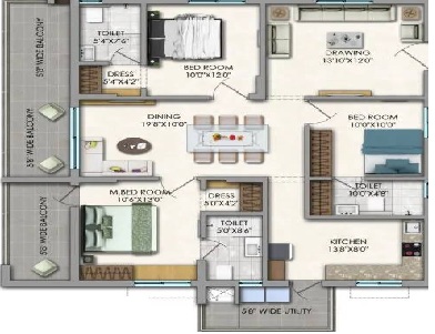 UTILITY: Anti-skid, acid resistant ceramic tiles of Kajaria/Somany or RAK or equivalent make with washing machine provision.
