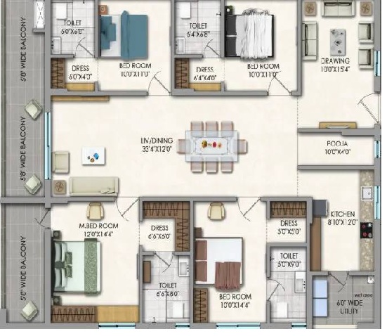 ALL BEDROOMS: 600 MM X 600 MM Double charged vitrified tiles of Kajaria/Somany or RAK or equivalent make with 4" skirting.