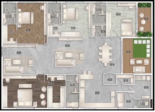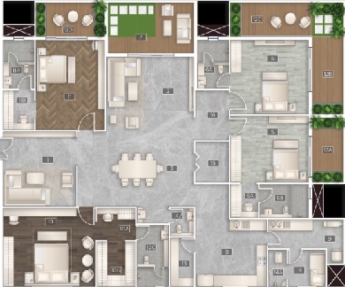 Entertainment room, Master bedroom, Children bedroom, Guest bedroom: Engineered wooden flooring with 4’x4’ of Imported make.