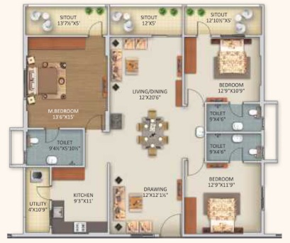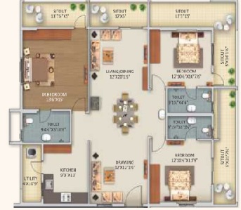 Balcony & Sitouts: 600x600 mm superior quality wooden finish ceramic tiles of reputed make.