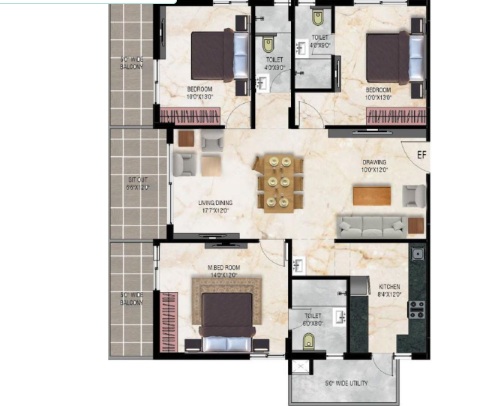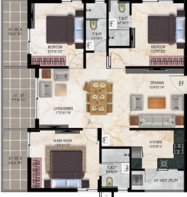 Living, Dining, Bedroom & Kitchen: 600 mm x 1200 mm size Glazed vitrified tiles of reputed make.