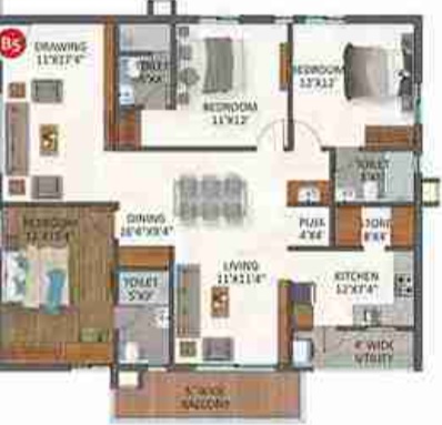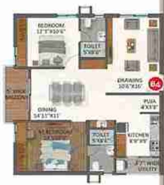 Reputed make with size of 600 mm x 1200 mm Vitrified tiles flooring in Hall, bedrooms, dining, Kitchen.
