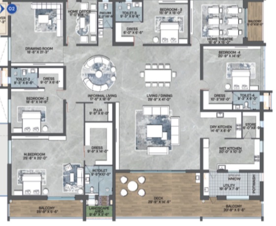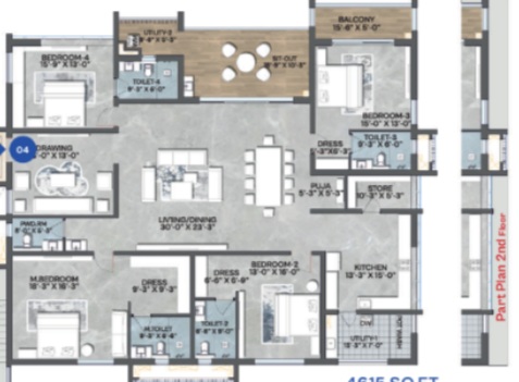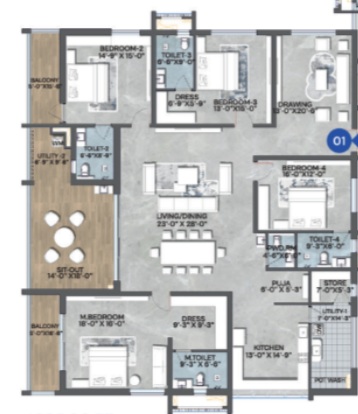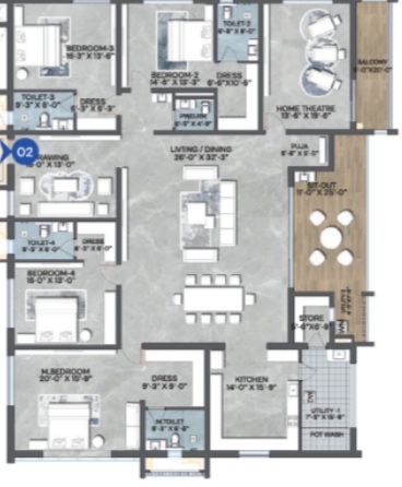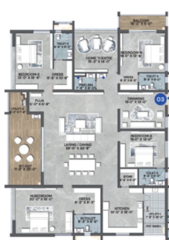 Balcony /Bathrooms /Utility: Anti-Skid Vitrified tiles of reputed make.