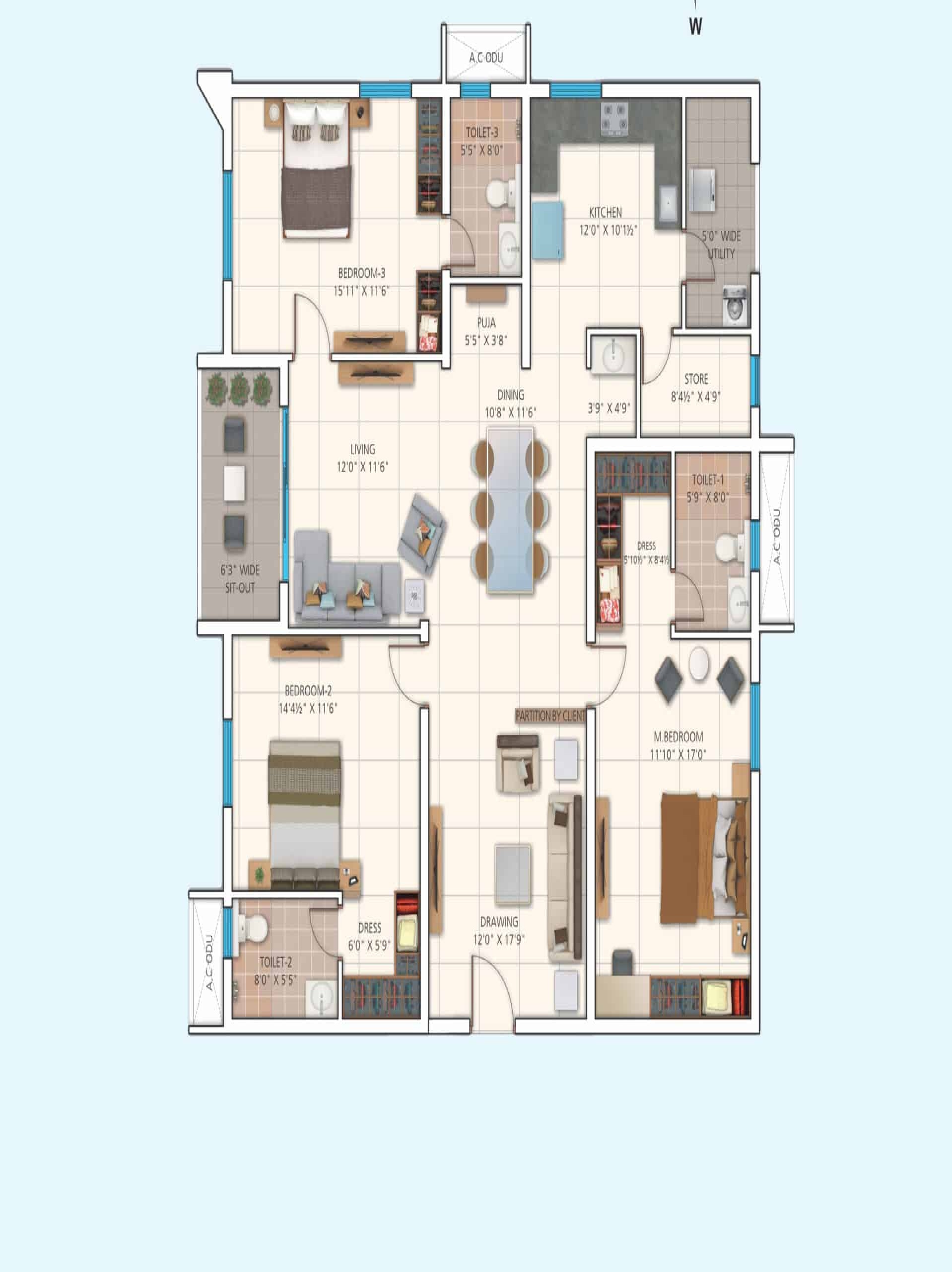 BATHROOMS/UTILITY DOORS: Granite frame with both side laminated flush shutter with reputed hardware.