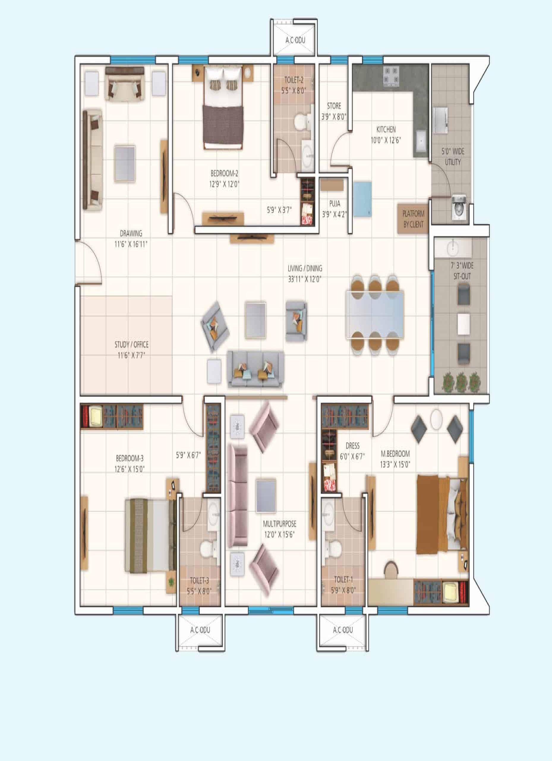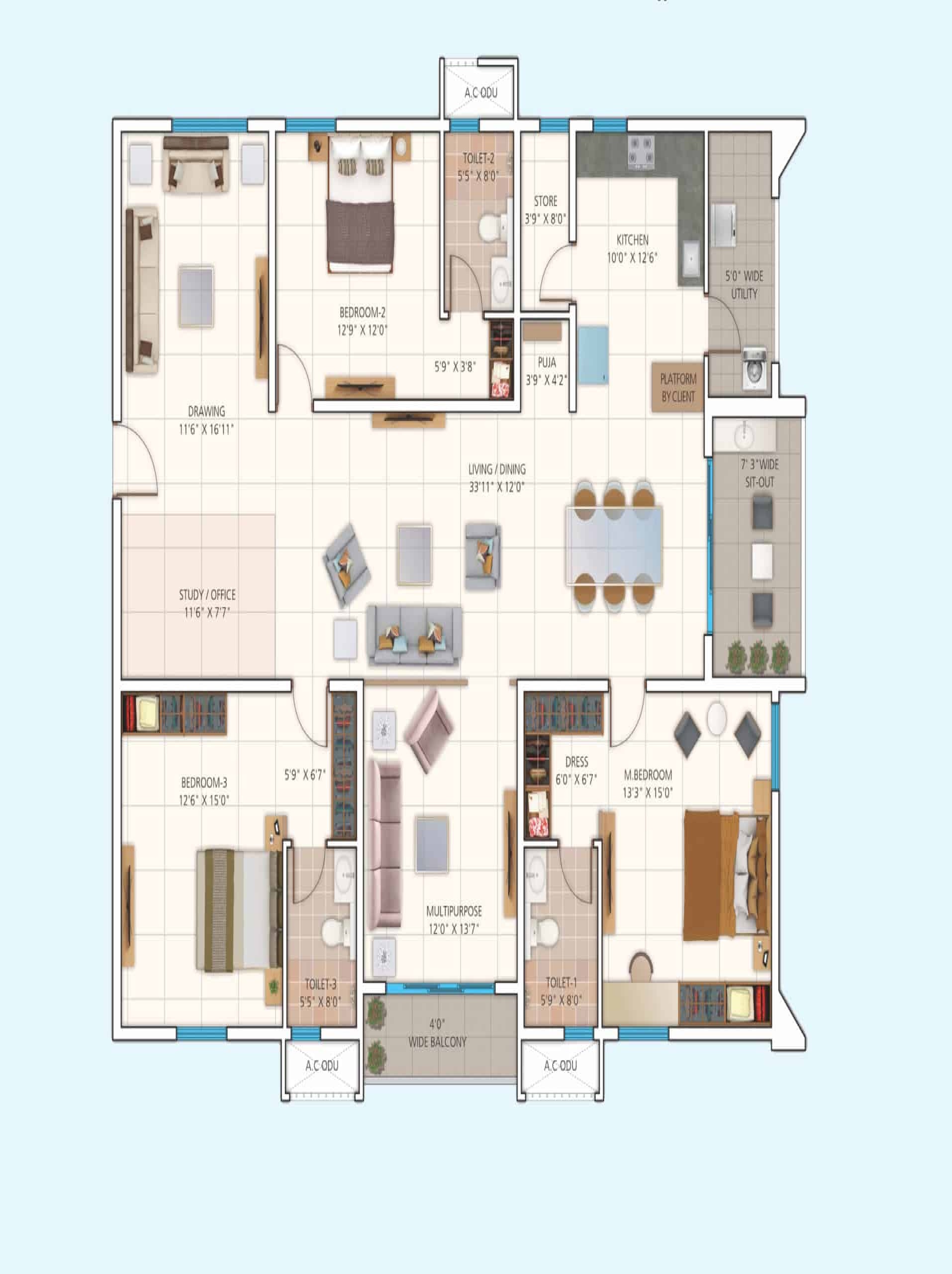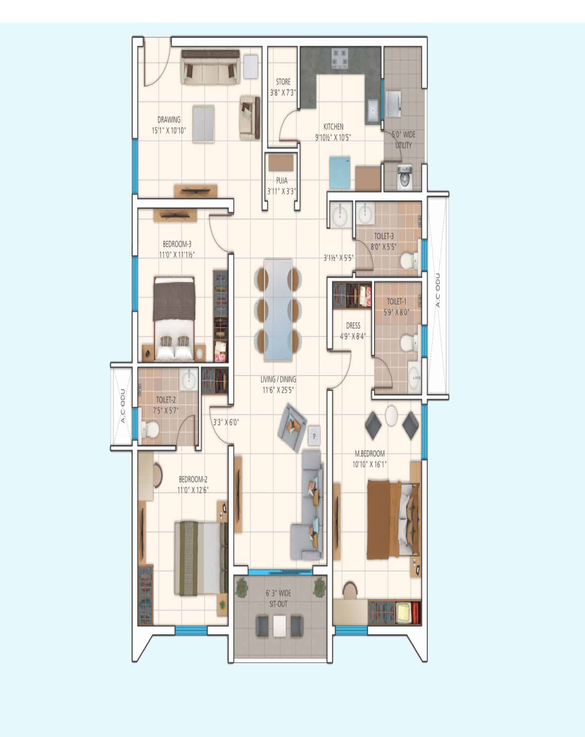 Waterproofing shall be provided for all Bathrooms, Balconies, Utility Area & Roof terrace.